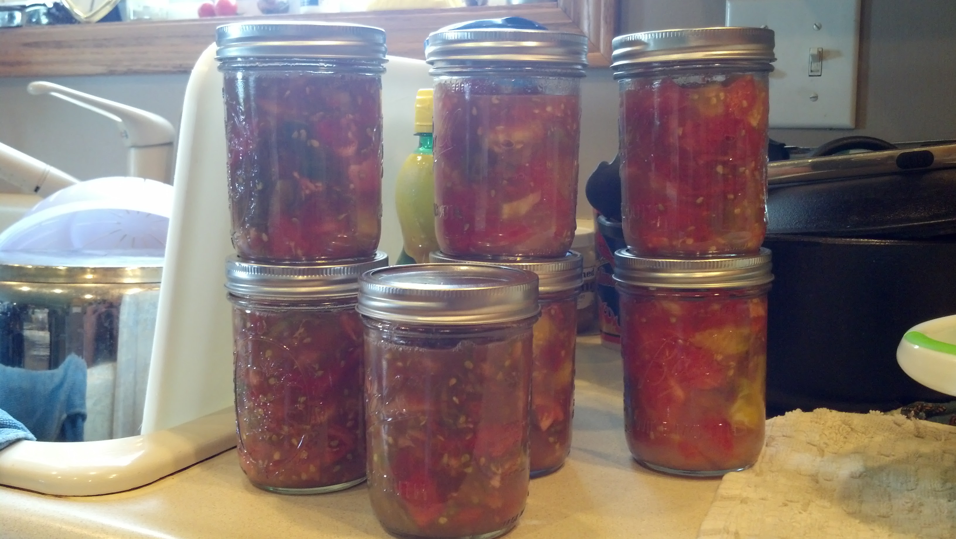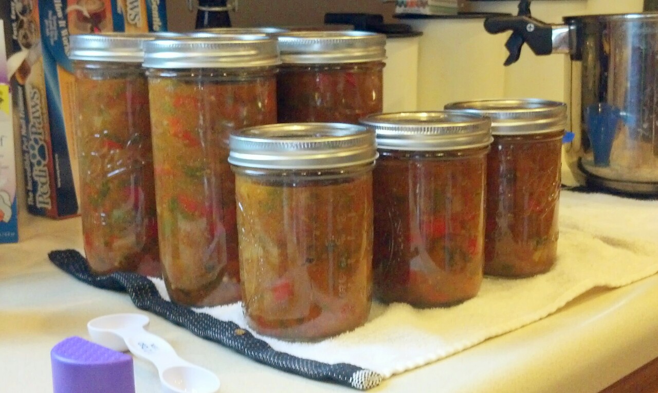 By the end of the day, I had 6 pint jars and 2 quart jars of spicy salsa.