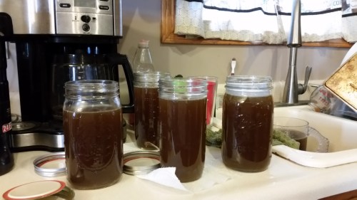 By the time it had cooked down and been strained, we had about 4 quarts left. I froze 2 quarts and made some chili with the rest.