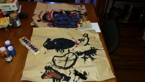 We made our own cave paintings with a paper grocery sack and acrylic paint and watched The Croods for fun.