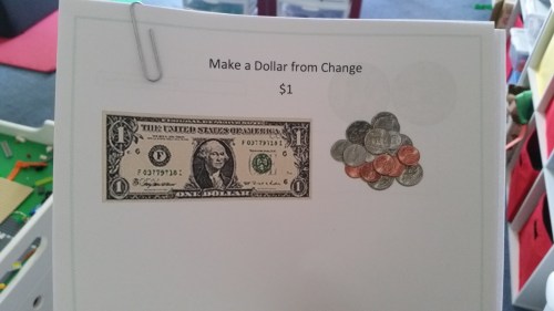 Then, we talked about how many of each coin it took to make a dollar. I handed out the printable I had made and told them if they made a dollar with each coin, they could keep all the change for their piggy banks.