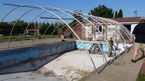 Now, the bones of the greenhouse are in our yard and our neighbor is ready to turn the pool back into a…pool.