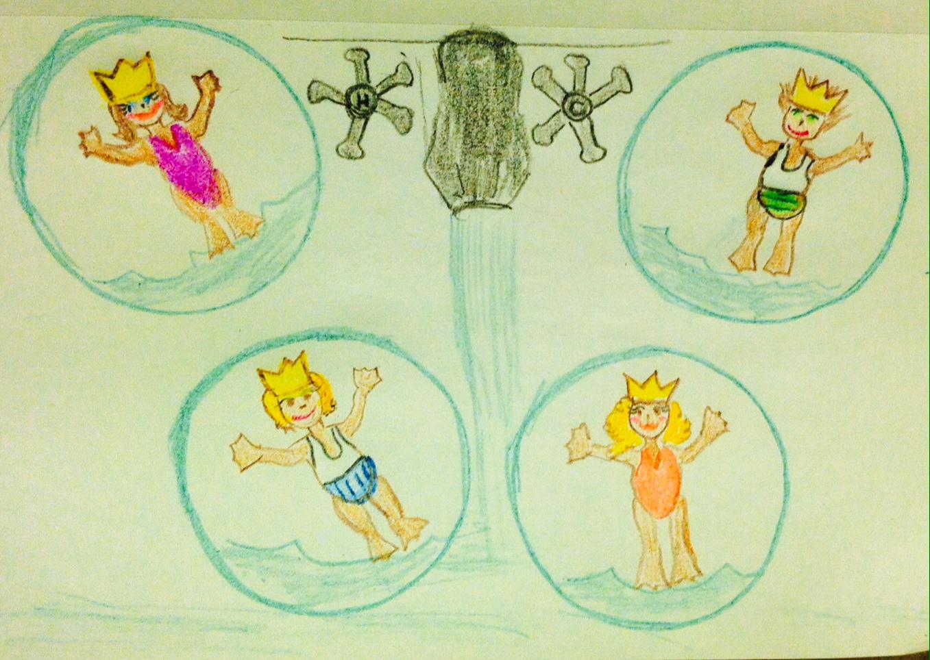 Three bubbles bounced over to the edge of the tub and the kids in them pointed to the bottle of soap.
