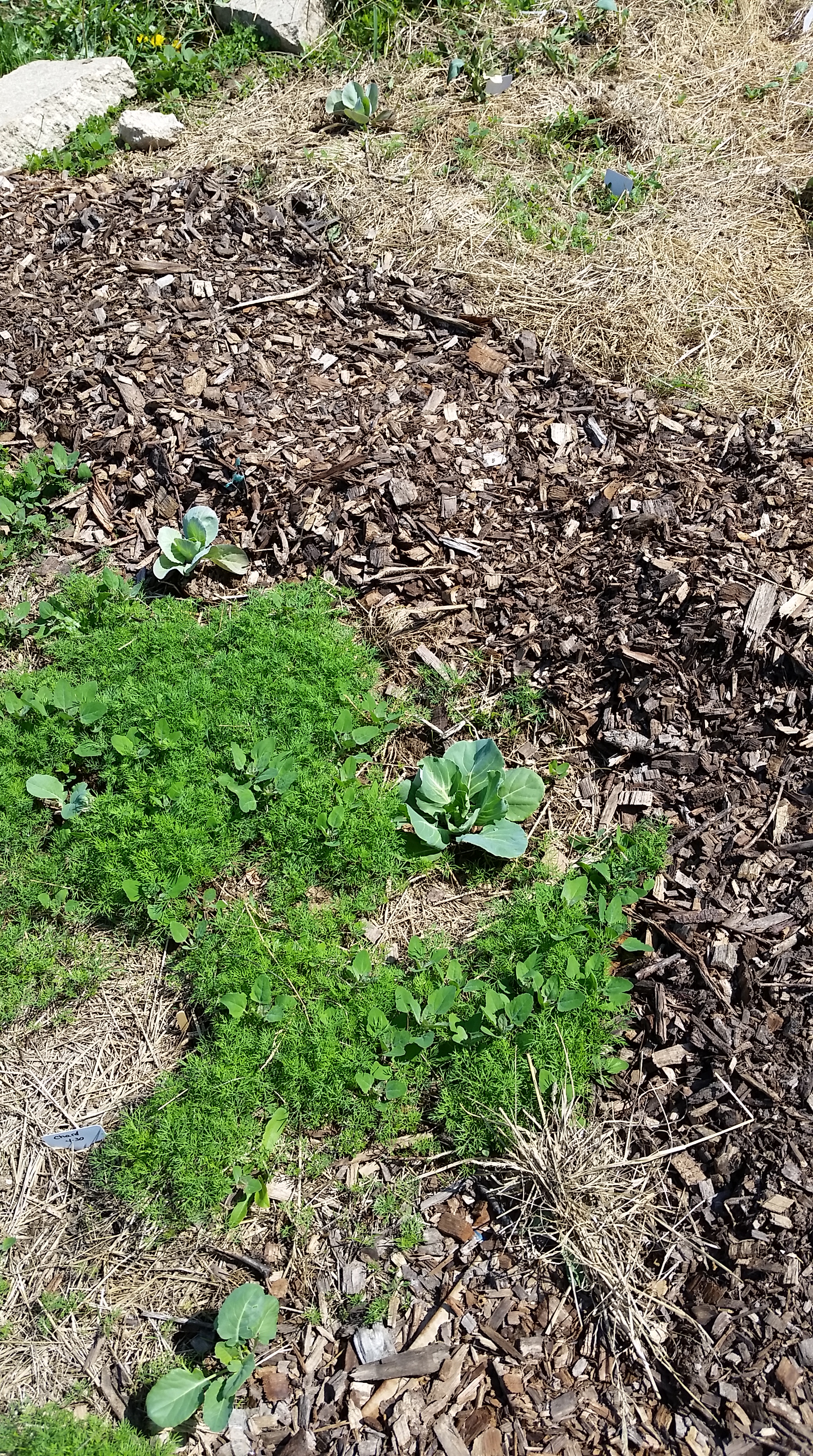 Walking by the kitchen garden, we checked on our cabbage and the blanket of dill that is spreading. We didn’t plant dill this year. All of this is coming up from last year and is perfectly placed to help the cabbage and cucumbers fight off pests.