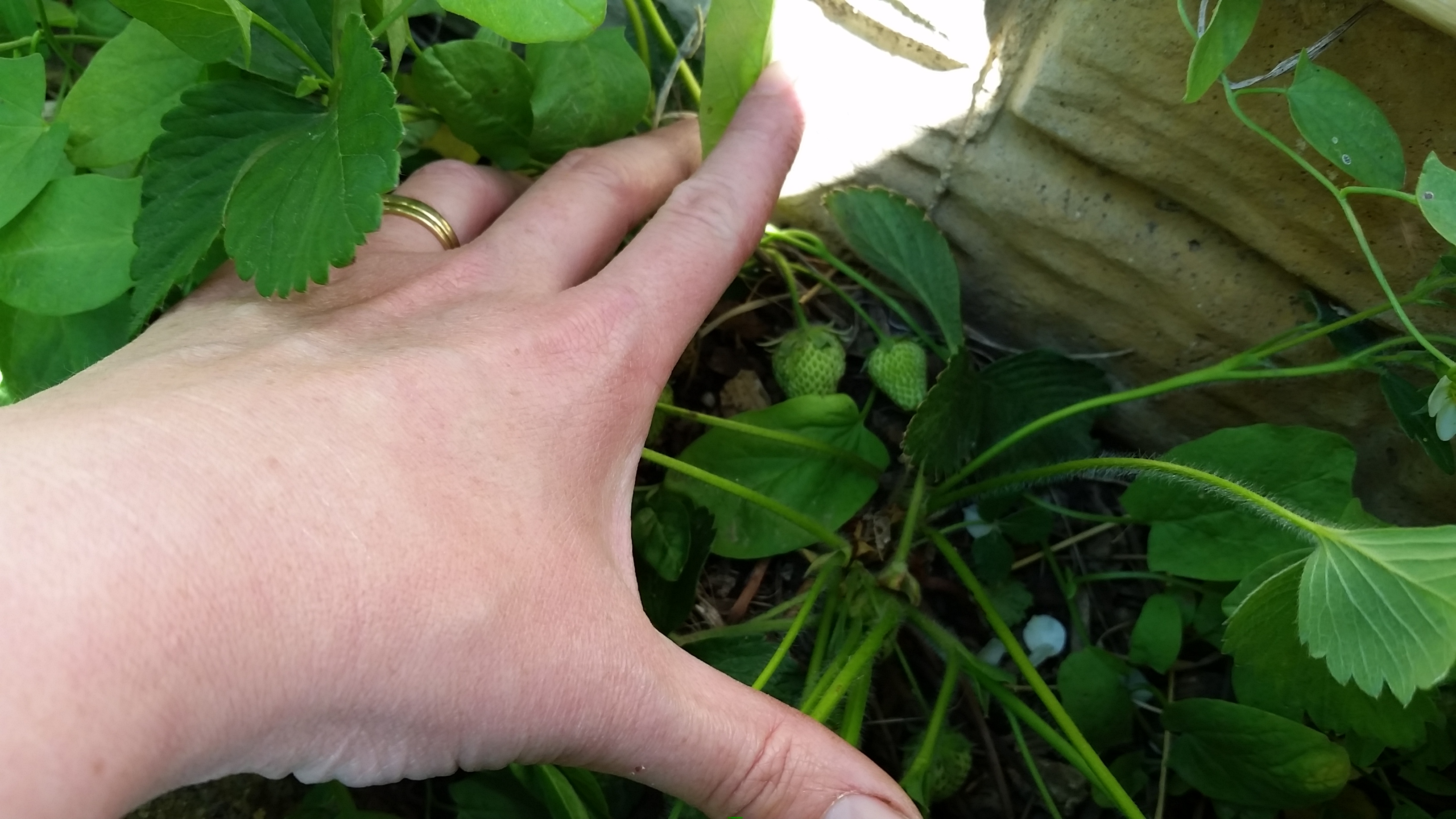 The strawberry patch is flowering and we even have a few green berries forming. The boys are concerned that they won’t get any so we are keeping it a secret from the birds.